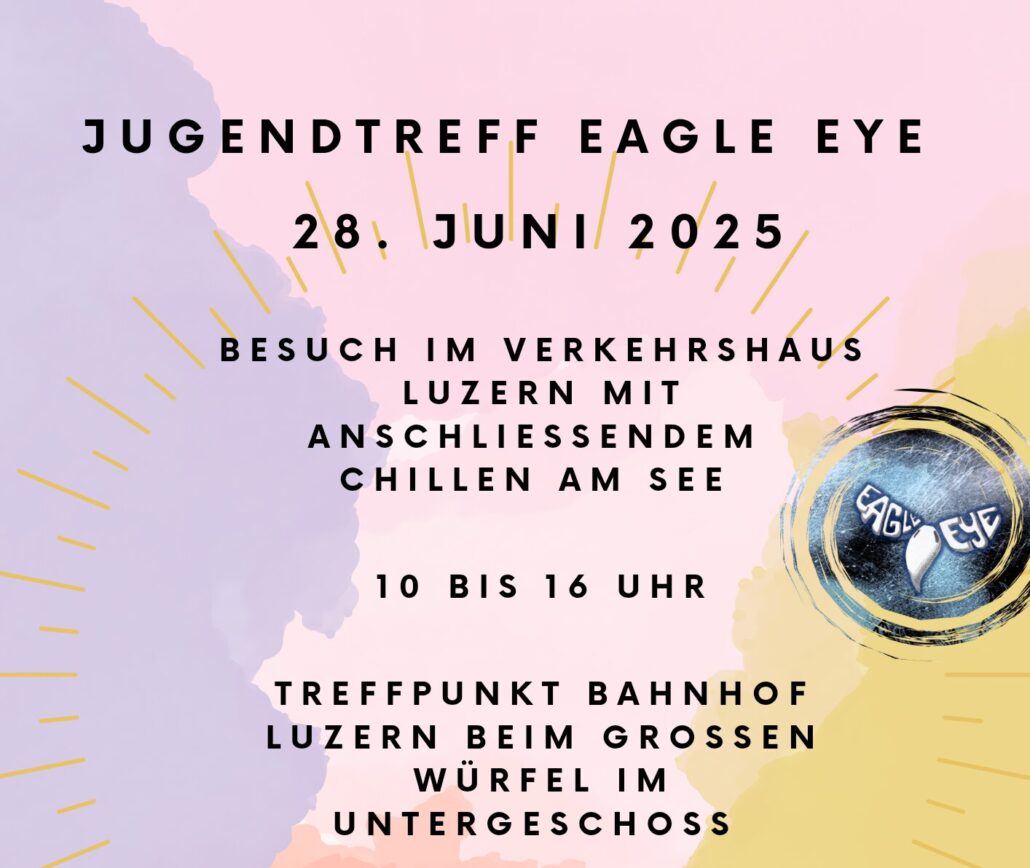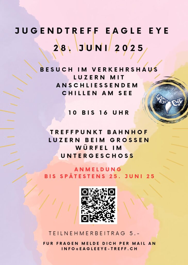Wir freuen uns auf den nächsten Jugendtreff am 26. Juni 2025 in Luzern! Dieses Mal erwartet dich ein spannender Nachmittag mit anschliessendem Chillen am See.