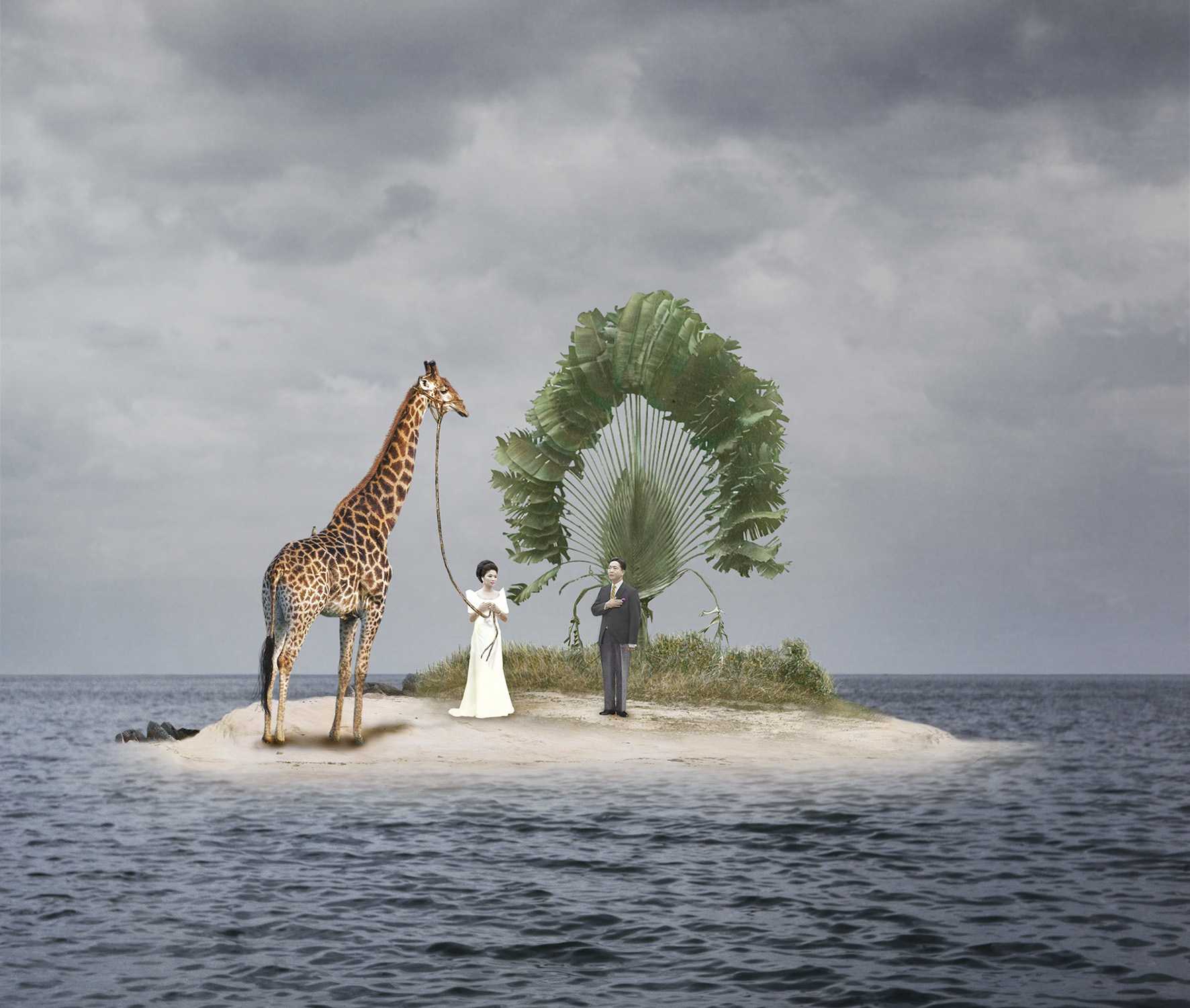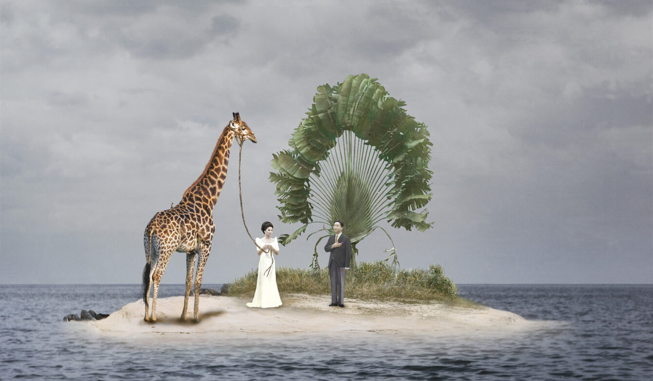 Ein Hochzeitspaar steht mit Giraffe auf einer Insel. Es ist ein Bild wie aus einem Traum, und doch voller Bedeutung. «Gehen und immer weiter gehen, ohne klares Ziel vor Augen» – so übersetzen die indigenen Stämme Kadazan und Dusun in Sabah, Malaysia, das Wort «Mansau-ansau». Genau dieses Gefühl fängt die Künstlerin Yee I-Lann in ihrer ersten grossen Einzelausstellung in Europa ein.