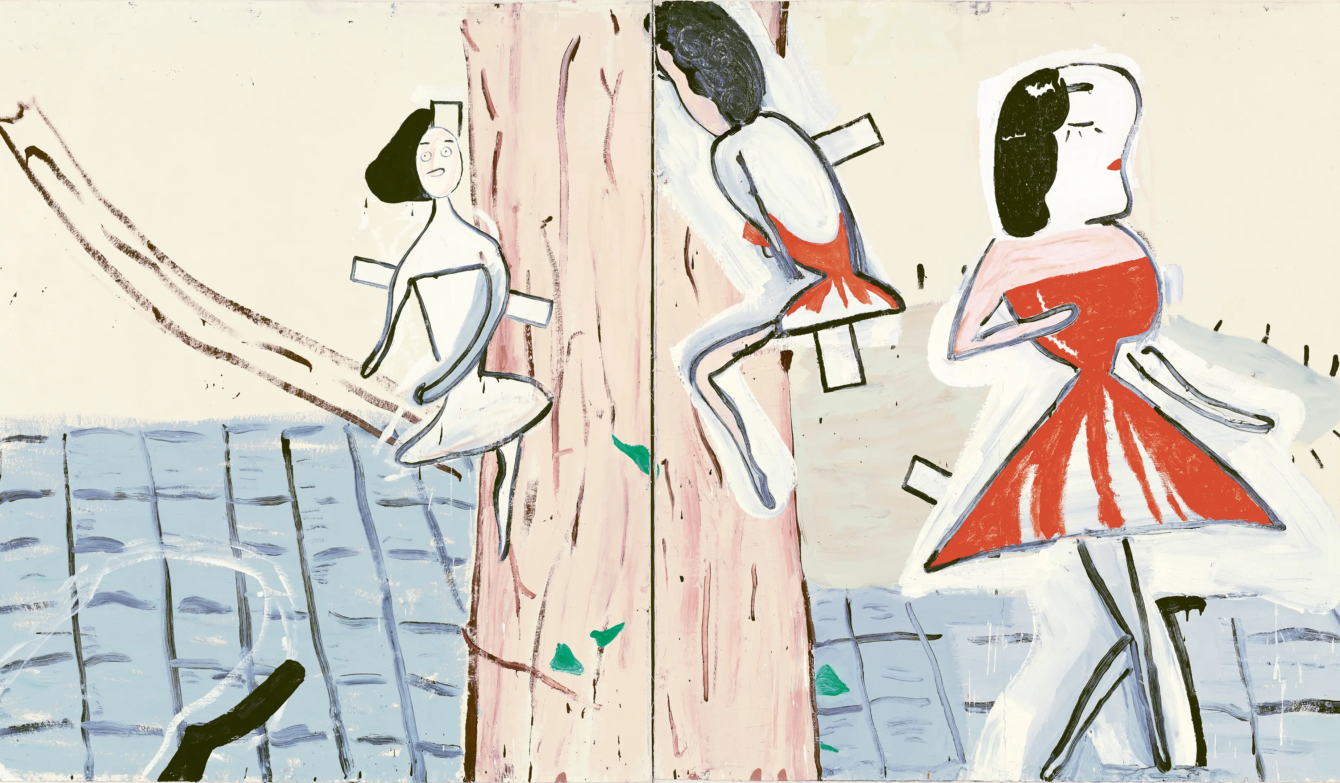 Bild: Rose Wylie, Red Twink and Ivy, 2002, Öl auf Leinwand, 183 × 504 cm, drei Teile (Ausschnitt) © Rose Wylie, courtesy the artist Photograph courtesy of Jari Lager
