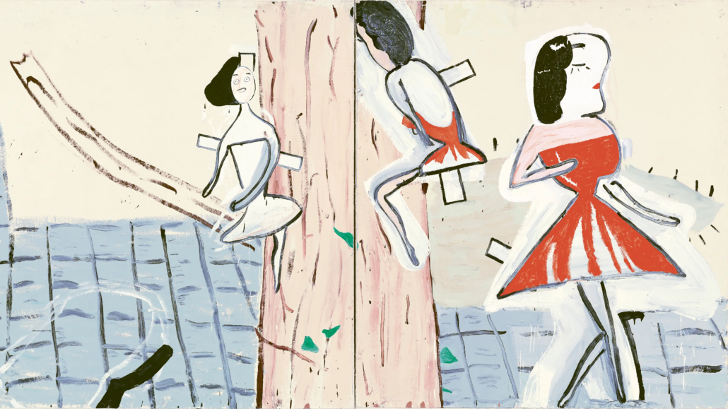 Bild: Rose Wylie, Red Twink and Ivy, 2002, Öl auf Leinwand, 183 × 504 cm, drei Teile (Ausschnitt) © Rose Wylie, courtesy the artist Photograph courtesy of Jari Lager