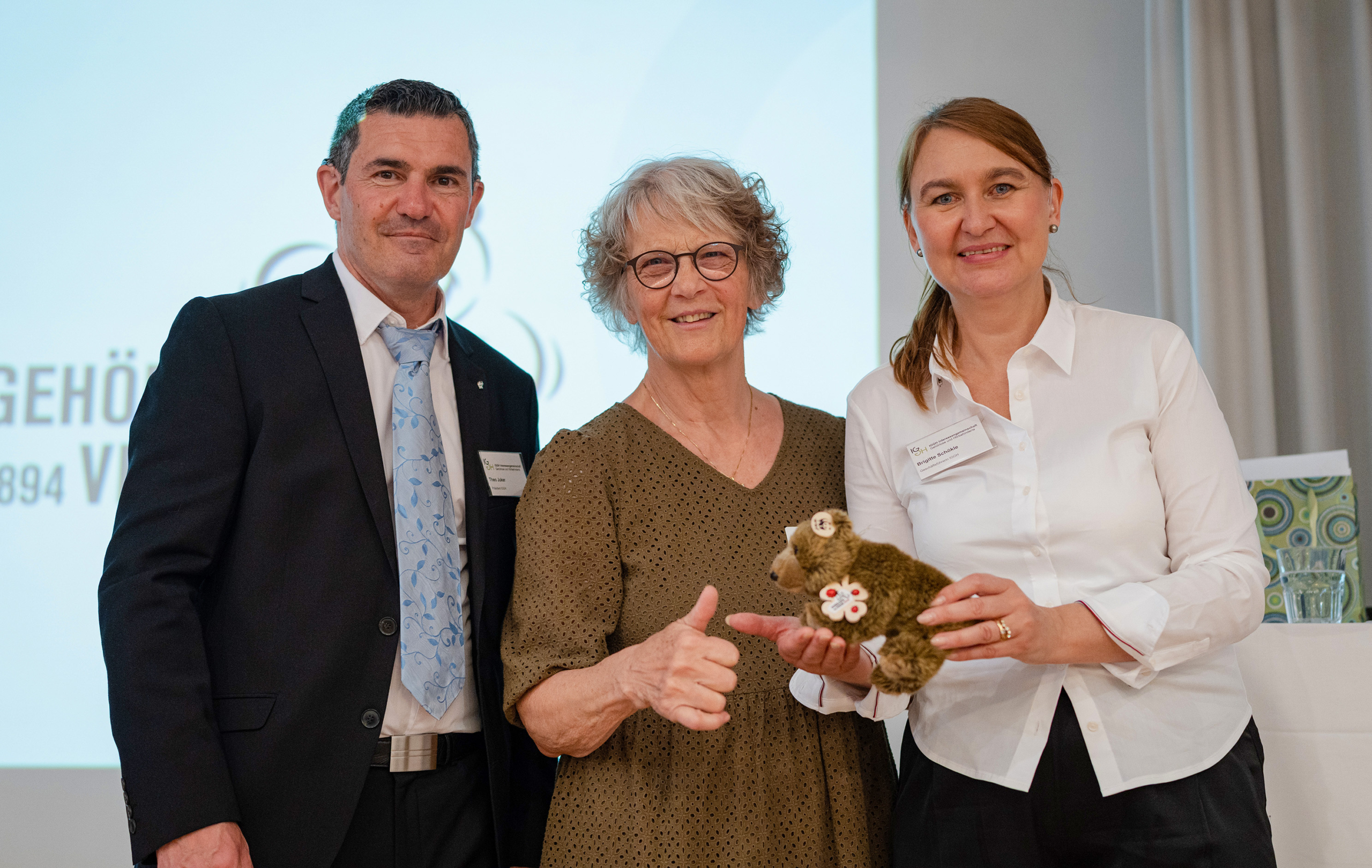 - Yvonne Zaugg, Präsidentin des Gehörlosenvereins Bern GVB, wünschte der IGGH für die nächsten 25 Jahre viel Glück und überreichte einen Plüschbären mit Glücksklee.