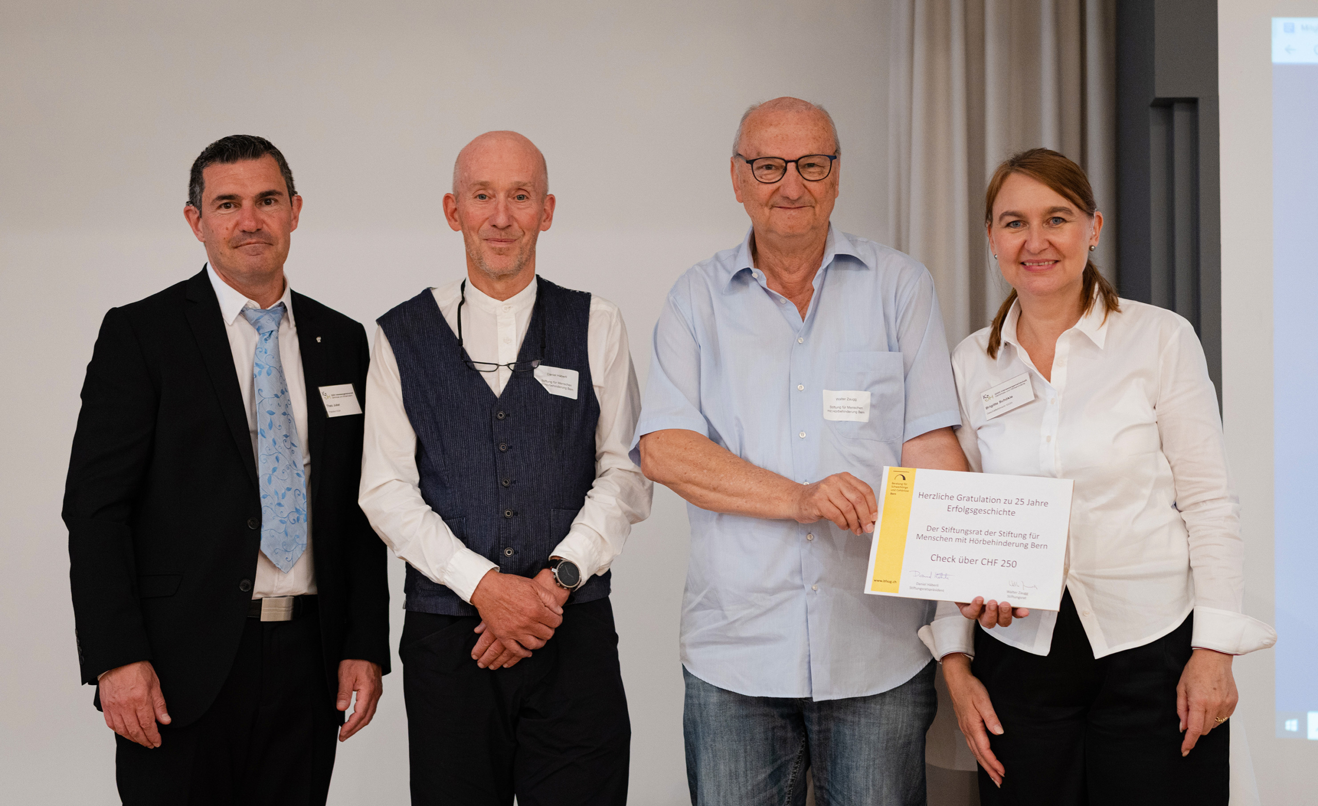 - Die Stiftung für Menschen mit Hörbehinderung Bern schenkte der IGGH einen finanziellen Beitrag. Von links: Theo Juker, Präsident IGGH, Daniel Häberli, Stiftungspräsident, Walter Zaugg, Stiftungsrat, Brigitte Schökle, Geschäftsführerin IGGH