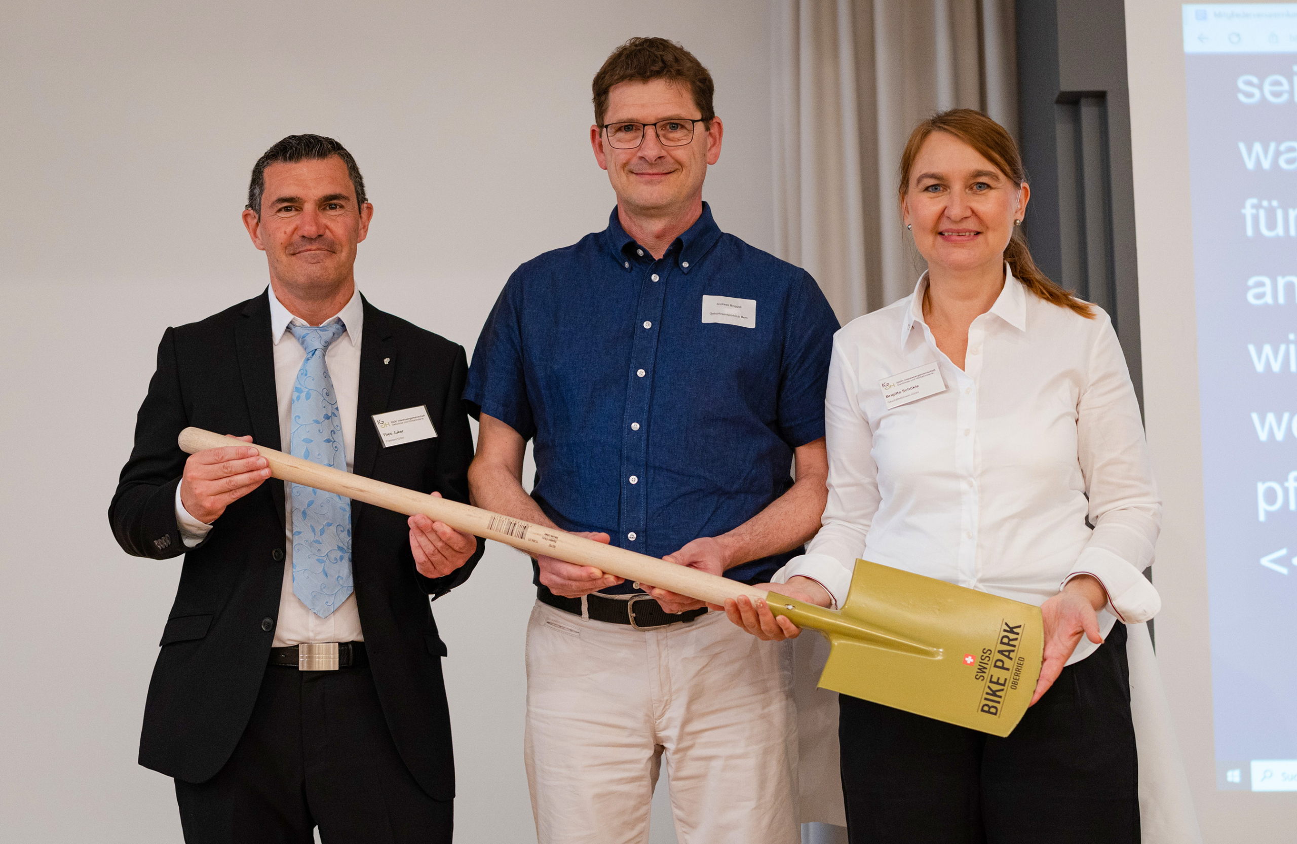 - Andreas Binggeli, Präsident des Gehörlosen Sportclub Bern GSCB, überreichte der IGGH einen Spaten des «SWISS BIKE PARK» in Oberried. Beim Gründungsakt des Veloparks halfen sie beim Aushub mit, von links: Theo Juker, Präsident IGGH, Andreas Binggeli, Brigitte Schökle, Geschäftsführerin IGGH