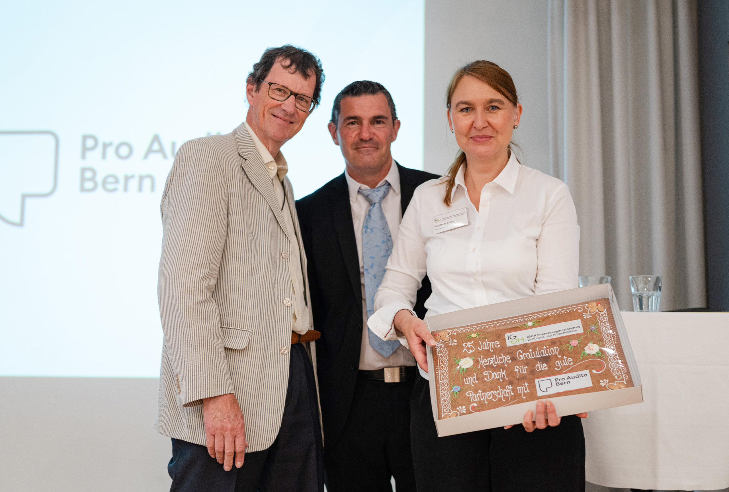 - Einen grossen Lebkuchen mit schriftlicher Widmung schenkte Christoph Künzler, Präsident von Pro Audito Bern (links). Neben ihm stehen Theo Juker, Präsident IGGH und Brigitte Schökle, Geschäftsführerin IGGH.