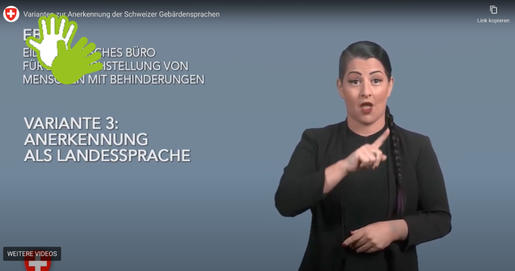 Auf dieser Seite erklärt das Eidgenössische Büro für die Gleichstellung von Menschen mit Behinderungen EBGB, welche Varianten zur Anerkennung der Gebärdensprache zur Diskussion stehen.