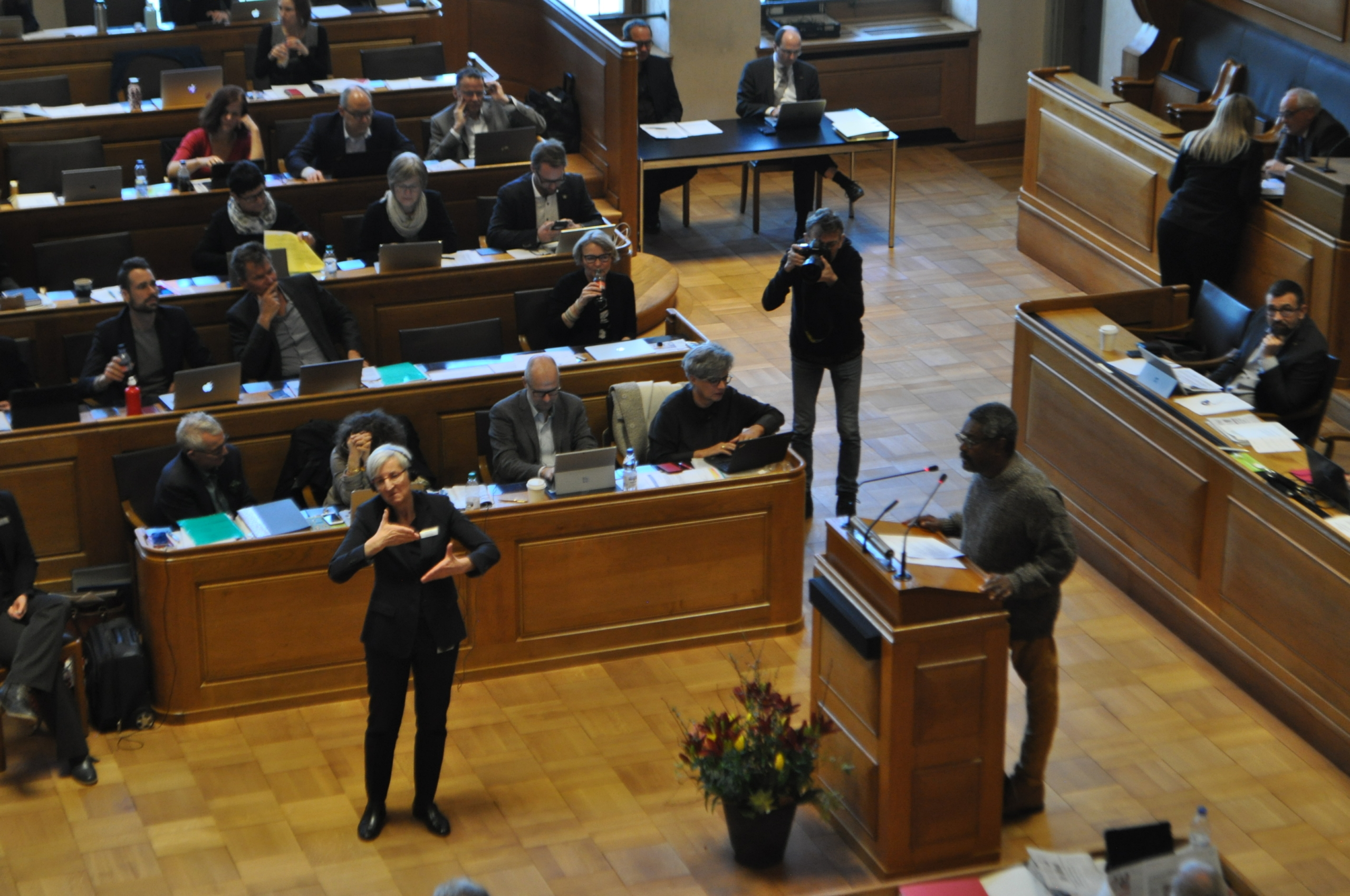 Foto: Ein Grossrat meldet sich zu Wort und wird von einer Dolmetscherin in Gebärdensprache übersetzt.