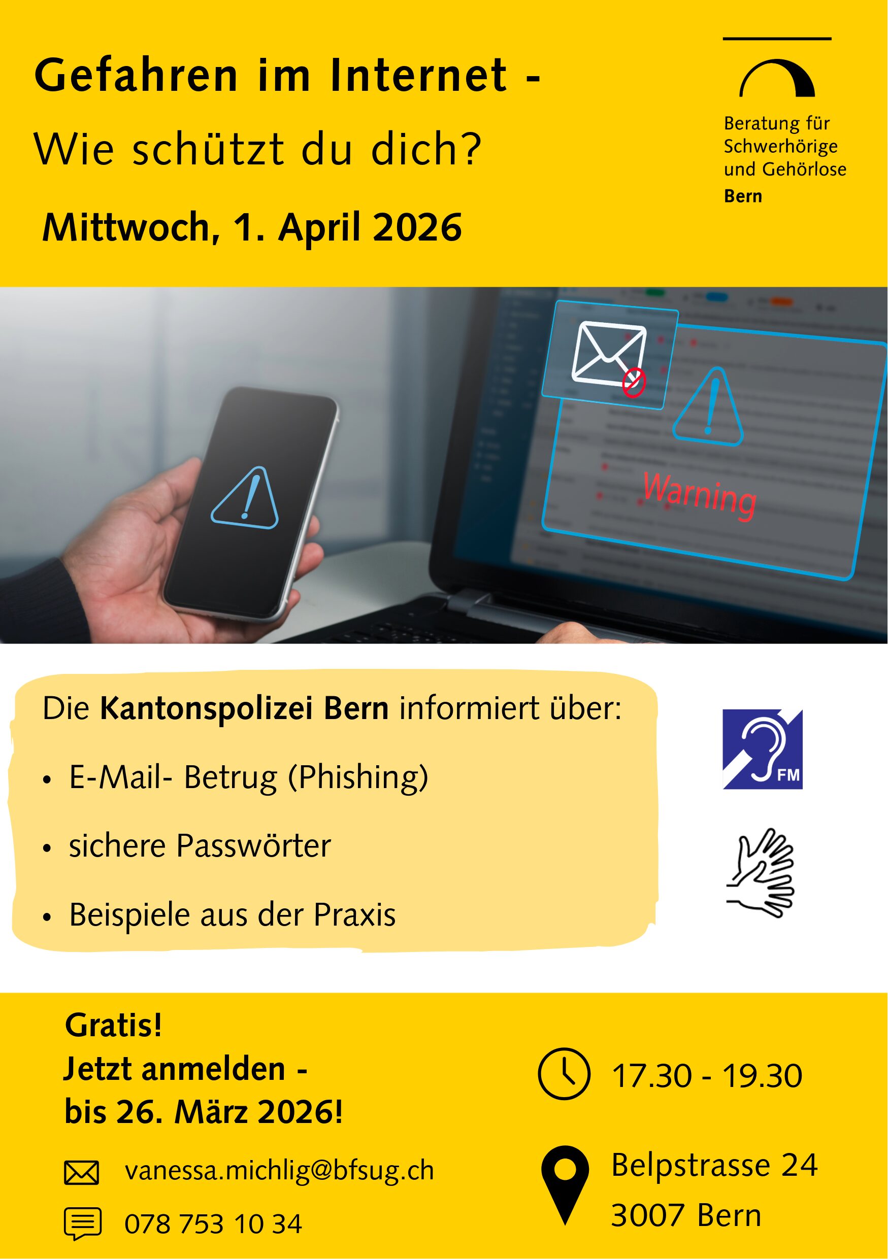 Die Beratung für Schwerhörige und Gehörlose Bern lädt zu einem Informationsabend zum Thema „Gefahren im Internet – Wie schützt du dich?” ein.