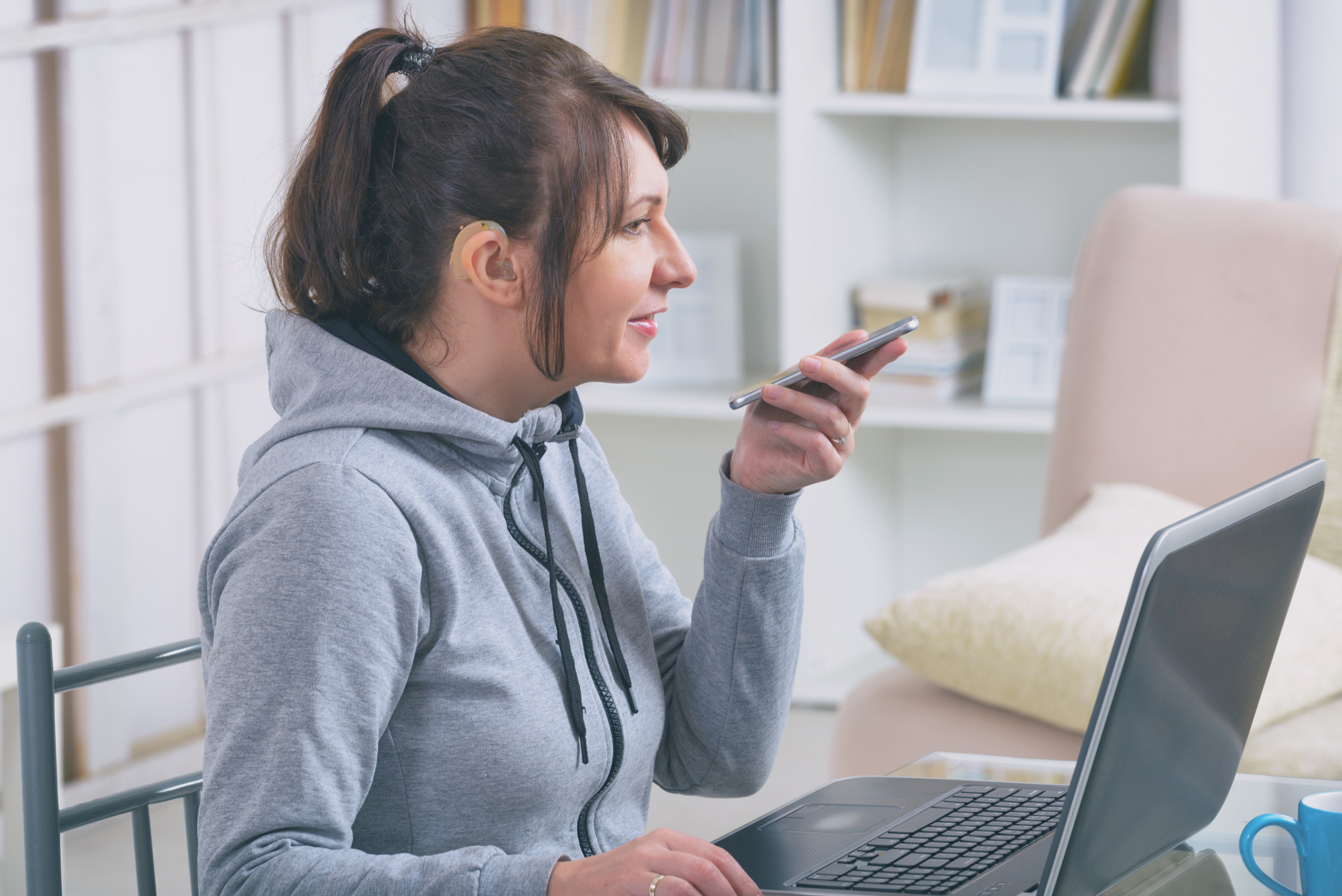 Visualbild Hörhilfetragende bei der Arbeit mit Smartphone und Notebook
