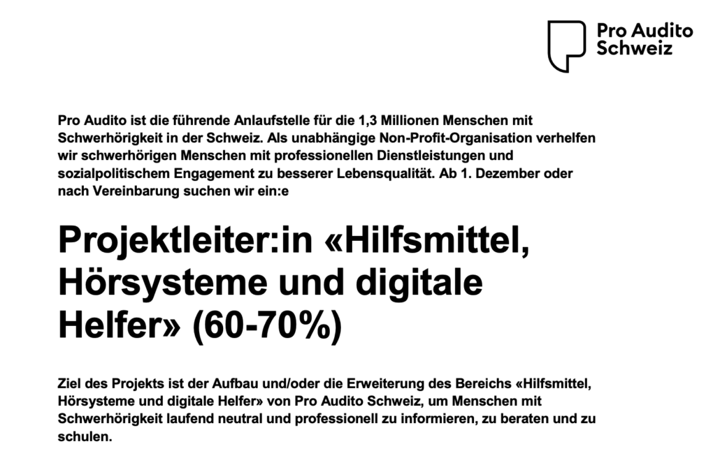 Ab 1. Dezember 2022 oder nach Vereinbarung sucht Pro Audito Schweiz ein:e Projektleiter:in «Hilfsmittel, Hörsysteme und digitale Helfer» (60-70 %).