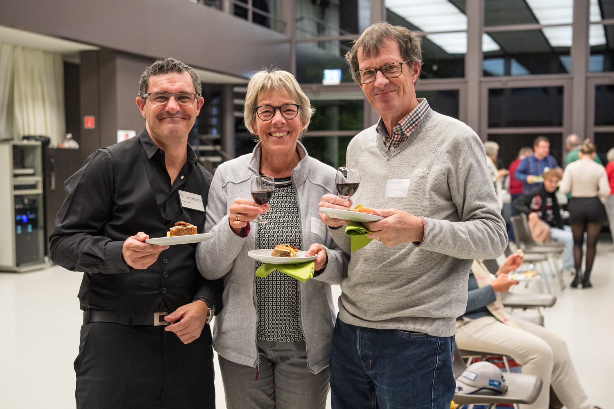 - Sie genossen das feine Apéro von links: Theo Juker, Präsident IGGH, Therese und Christoph Künzler, Präsident Pro Audito Bern.